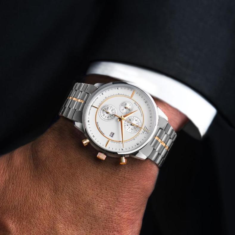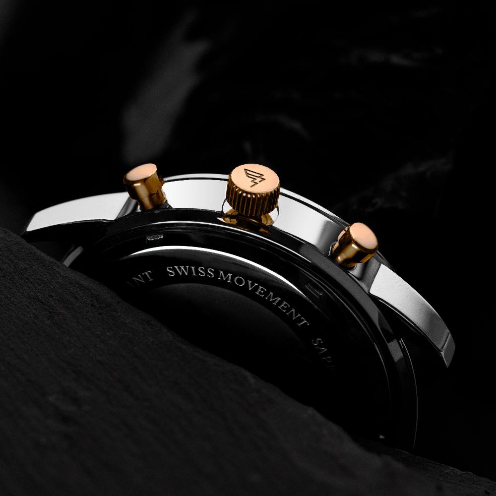 An exclusive timepiece adorned with 18K gold-plated details that highlight its luxurious allure. Each watch showcases opulence and refined taste. At the heart of this exquisite watch lies the unmatched precision of the Swiss "Ronda" 3540.D movement, renowned for its reliability and accuracy, encased in durable stainless steel and topped with scratch-resistant sapphire crystal glass.