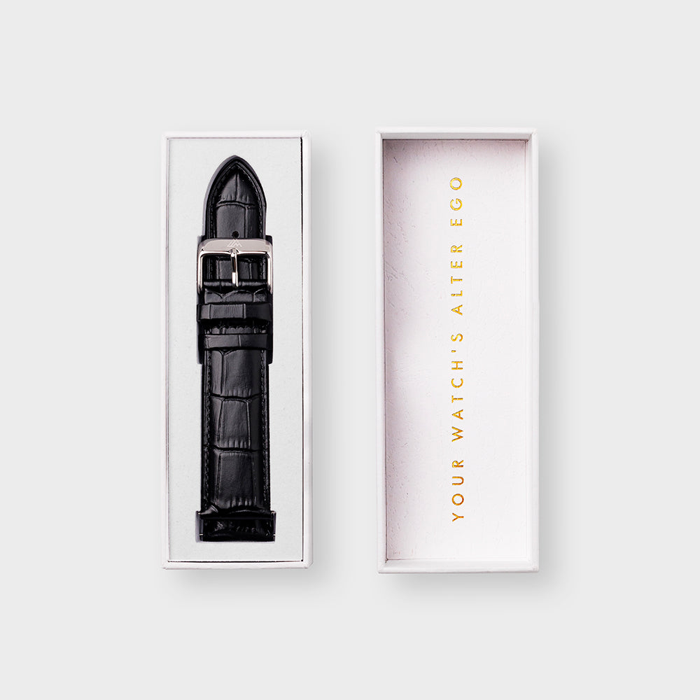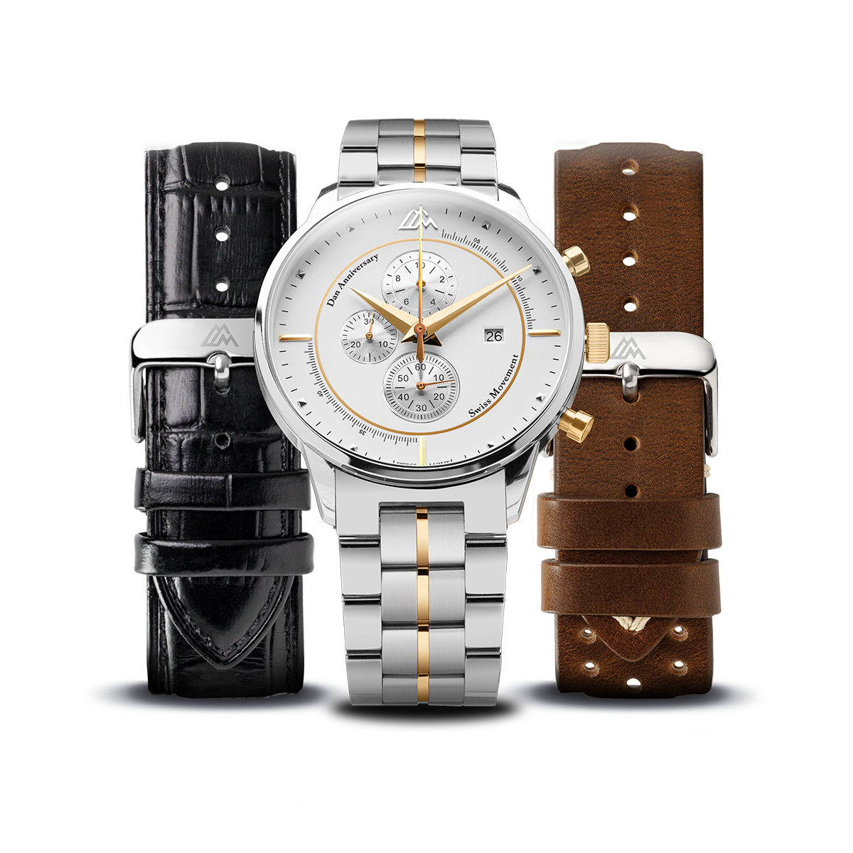 Selection of exclusive interchangeable straps designed specifically for the Anniversary model. Choose between the Perforated Brown Leather, the Black Crocodile Leather, the Classic Stainless Steel Bracelet, or the Steel Bracelet with 18K gold-plated details for a touch of luxury. Effortless to switch, each strap transforms your watch to match any occasion.