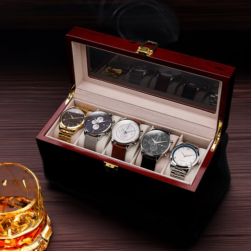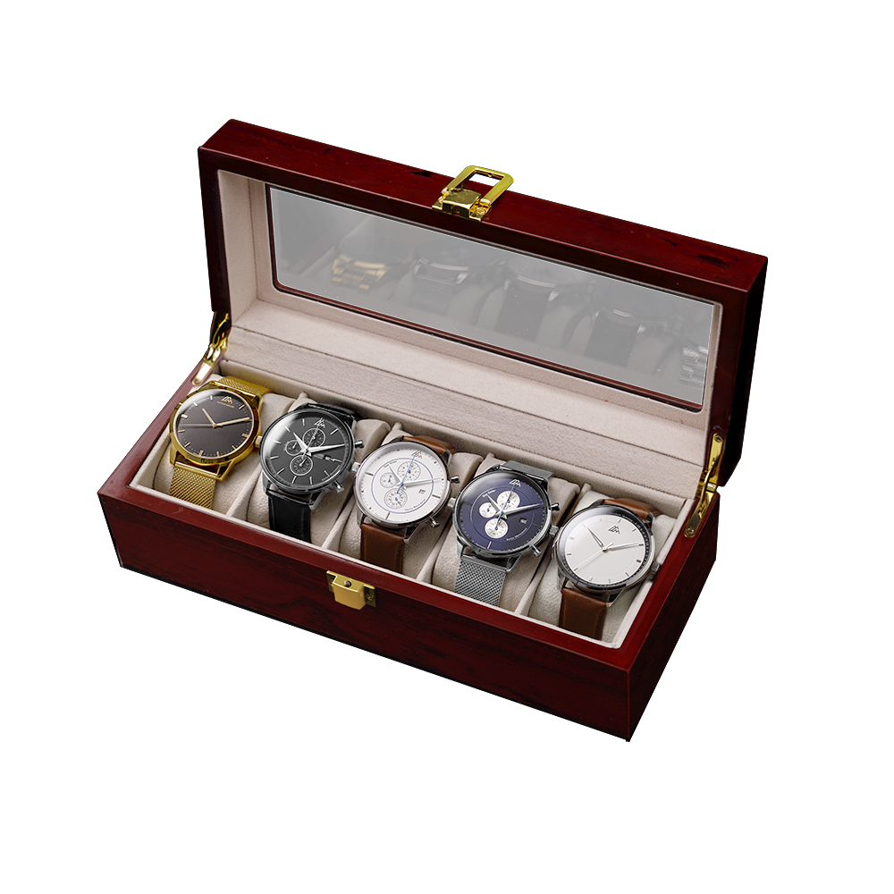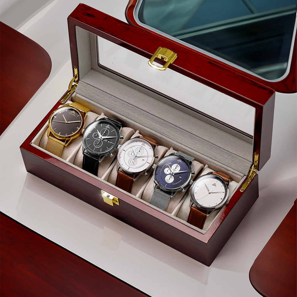 Introducing the "Royal Flush Set - custom" - an exquisite collection of timepieces elegantly presented within a luxurious wooden box. Crafted to perfection, this exceptional set exudes sophistication and style, showcasing a remarkable ensemble of five distinct watches that seamlessly blend design excellence with Swiss Movement precision.
